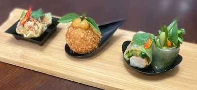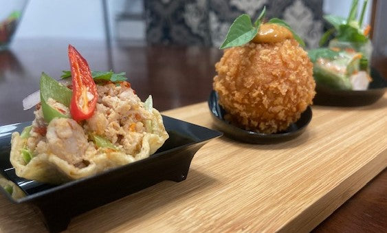 Possible suggestions are Gai Sap, Dumplings, Vegetable Rolls, Tuk-Tuk Chicken, Baby Dragon Eggs, Summer Rolls, Laab Moo Shooters. With all Thai food, unique sauces are available.